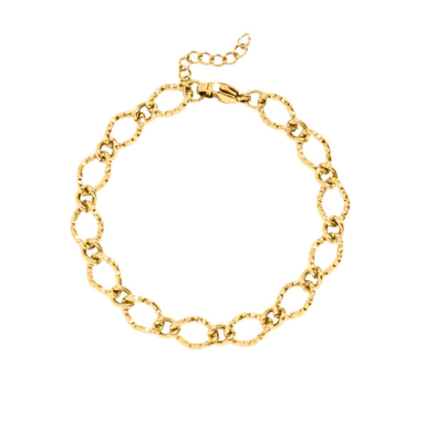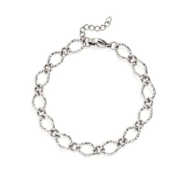 Discover understated luxury with this hammered chain bracelet. The textured surface catches light beautifully, creating depth and visual intrigue, while the sleek oval links maintain a polished, contemporary edge. A refined accessory that seamlessly enhances any look, bringing quiet confidence and timeless sophistication to your jewelry collection.