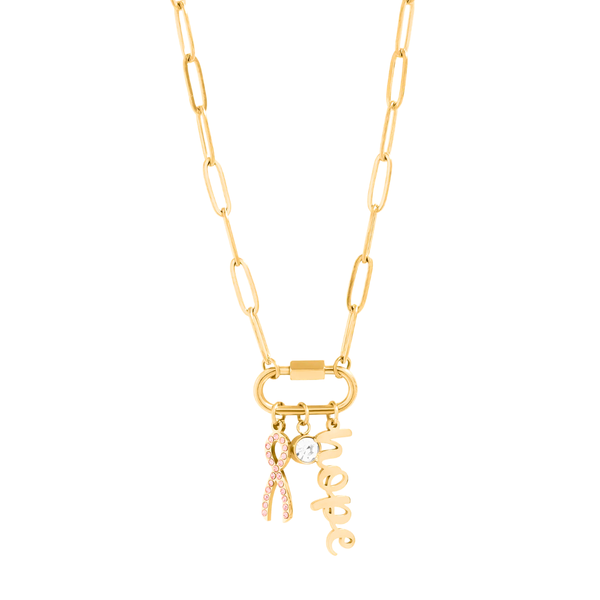 Celebrate strength with the Breast Cancer Paperclip Necklace. Crafted with sleek, elongated paperclip links and a stylish carabiner clasp, it features delicate accents including a hope charm, CZ stone, and a pink CZ ribbon charm. This necklace symbolizes unity and perseverance, serving as a meaningful reminder of the courage and hope behind every ribbon. Perfect for layering or worn alone, it makes a heartfelt statement every day. Available in gold or stainless steel, it lets you wear your support with pride.